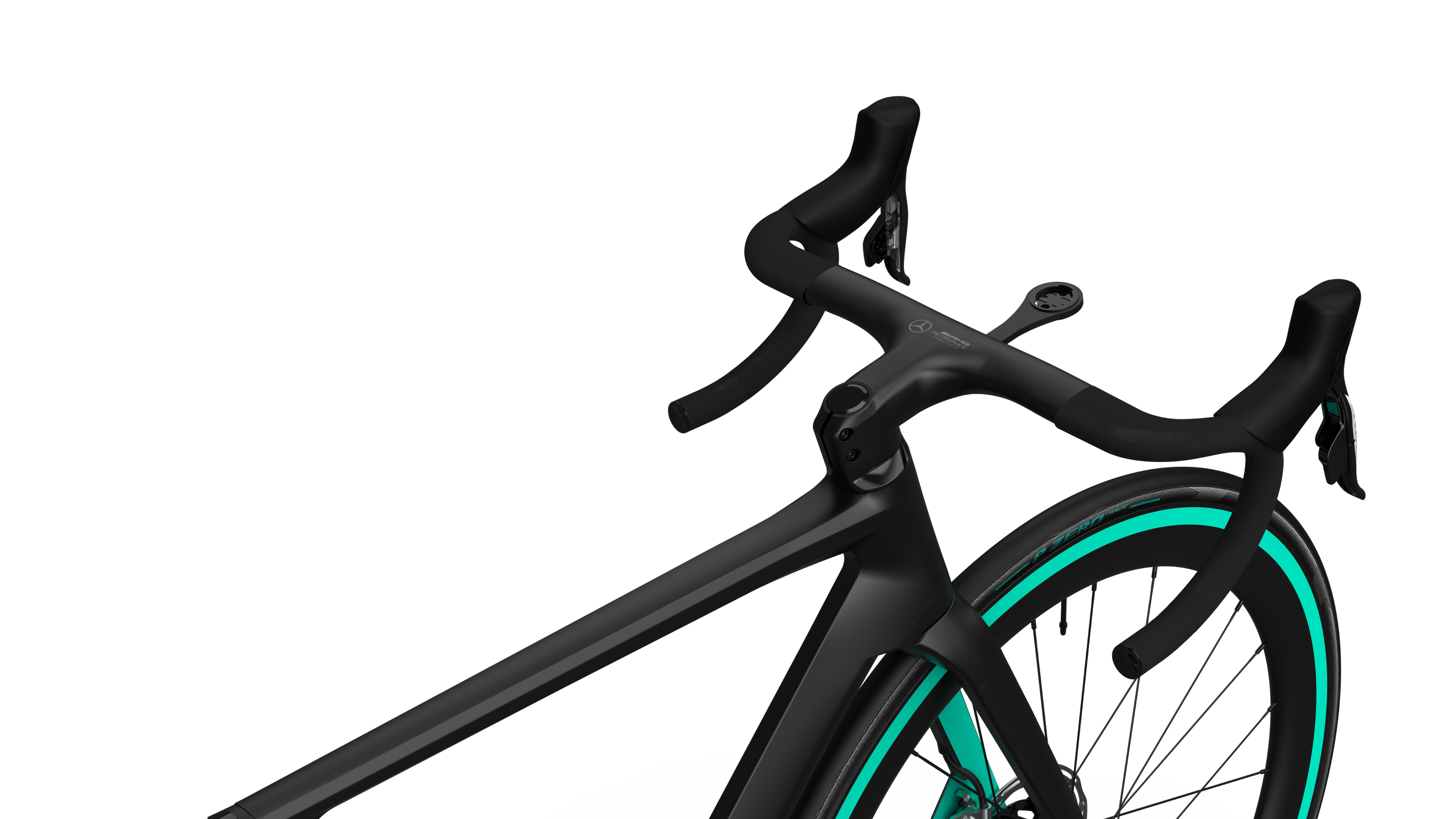 Mercedes-AMG PETRONAS F1® Team fully integrated carbon fiber cockpit integrates handlebars and stem, conceals all cabling, and is aerodynamically optimized to reduce drag. The use of carbon also reduces road vibrations for improved comfort.